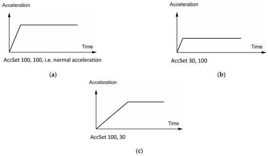 Defining accelerations and decelerations in the RAPID language is possible by defining the percentage value of acceleration and the percentage value of the increase of acceleration. The method of changing the accelerations set by the AccSet function is presented in Figure 4. Figure 4a shows nominal acceleration values, at a maximum for a given station structure. Percentage change of their values is possible, e.g., by using the AccSet function with parameters. The first parameter corresponds to the limitation of the nominal acceleration value as a percentage. In Figure 4b, for example, the acceleration value is reduced to 30% of the maximum acceleration value. The second parameter corresponds to the value of the speed of acceleration increase. In the example in Figure 4c, the acceleration gain is limited to 30% of the standard value.