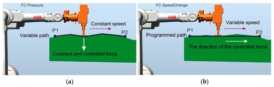 The Test Signal Viewer tool allows for selecting the parameters of force control systems. The use of the Force Control (FC) package allows controlling the force exerted by the tool on the workpiece. The use of such a solution enables the robot to interact with the environment by controlling the process using the strategy of FC Pressure or FC SpeedChange. The FC Pressure option enables polishing or grinding of elements with variable geometry (e.g., castings) while maintaining a constant pressure of the tool on the surface of the workpiece at a constant defined process speed. The idea of this solution is presented in Figure 5a. The use of this function allows the material to be processed at a constant speed and control of the force perpendicular to the processed surface. The tool travel path follows the curvature of the surface.