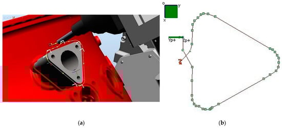 For the workpiece, when executing the trajectory along the path (force control in the Z axis of the tool) at the last third turn (Figure 8a), the force control stops working properly. The disturbance of the force control package occurred at the set force of 2 N, and the gradual increase of the feed force minimizes this effect []. Figure 8a shows the effect of the decrease in the value of the forces between the tool and the workpiece while moving along a triangular path and Figure 8b shows what the correct trajectory should look like.