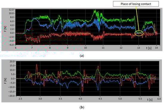The problem of loss of force control was encountered during the research work (Figure 8a). The manufacturer states that the tool works from the value of the controlled force at the level of 1 N in the Z axis.