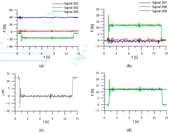 Signals corresponding to the values of forces in various reference systems recorded with the use of Signal Test Viewer software, at the set force 12 N and the rate of force increase FC = 75 N/s: (a) the signals in the force sensor reference system xS, yS, zS; (b) signals in the tool coordinate system xT, yT, zT; (c) force error; (d) set and actual force.