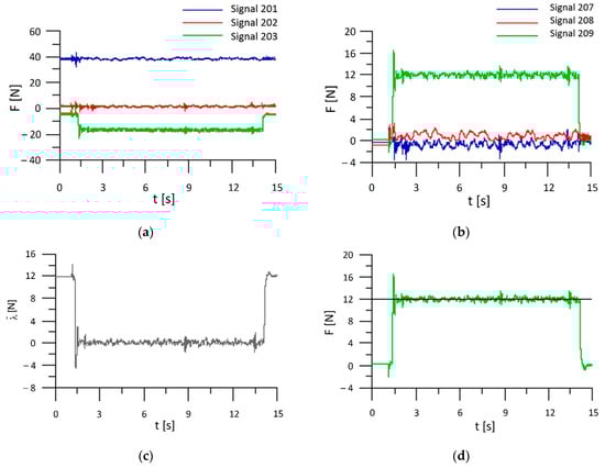 Signals corresponding to the values of forces in various reference systems recorded with the use of Signal Test Viewer software, at the set force 12 N and the damping coefficient D = 100 %: (a) the signals in the force sensor reference system xS, yS, zS; (b) signals in the tool coordinate system xT, yT, zT; (c) force error; (d) set and actual force.