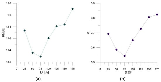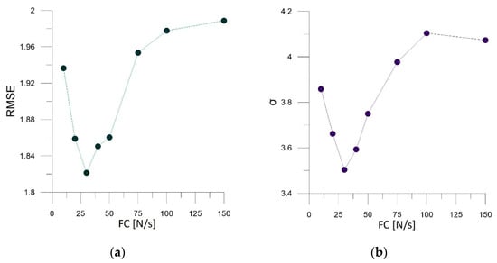 The smallest values of the root-mean-square error and standard deviation ratios were observed for a damping ratio of D = 75% and a force increase ratio of FC = 30 N/s.