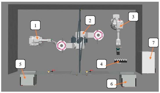 As part of the work carried out, a robotic station was developed to machine castings of gearbox housings made as gray cast iron castings made in disposable sand molds. A view of the station model is shown in Figure 14. The station components are described in Figure 15. The idea of the station’s operation is based on the use of the IRB1600 robot with a 2D laser scanner, which allows the measurement of fluctuations from the reference model. Then, the position offset of the cutting tool is calculated. The measured workpiece is transported with a five-axis IRBP B250 positioner to the machining zone, the so-called dirty zone. There, the IRB 4600 robot equipped with an electrospindle and tool storage performs the machining of workpieces.