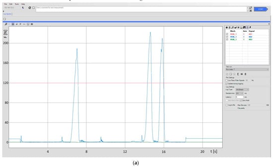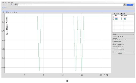 The change of the robot’s TCP point motion parameters, its monitoring and registration were carried out using RobotStudio software and the Signal Analyzer add-on. It is a tool that allows for recording a series of defined values at a speed of 40 times per second. The values of recorded parameters can be observed online in the scaled graphs or saved as text files or *.xls files. An example of the application window is presented in Figure 3.