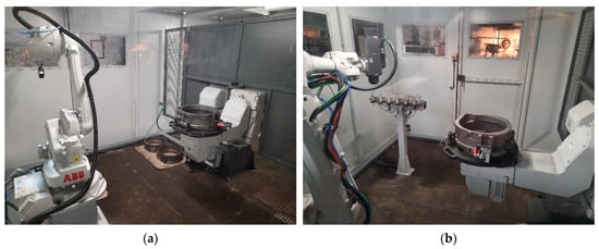 Robotic station in the production plant: (a) view of the measuring part; (b) view of the machining part.