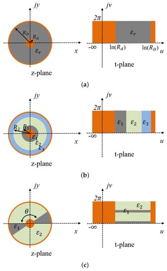 - Li, Q.; Zhang, Y.; Qu, L.; Fan, Y. Quasi-static analysis of multilayer dielectrics filled coaxial line using conformal mapping method. In Proceedings of the 2018 IEEE International Conference on Computational Electromagnetics (ICCEM), Chengdu, China, 26–28 March 2018; pp. 1–3. [Google Scholar]