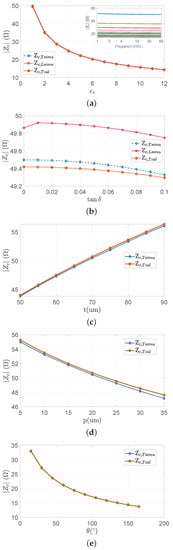 Impacts on the characteristic impedance of the (a) dielectric constant and (b) dielectric loss tangent values of the single substrate, (c) thickness of a BCB ring inserted in a Si substrate, (d) position of a BCB ring in a Si substrate, and (e) angle of a fan-shaped air area in a Si substrate.