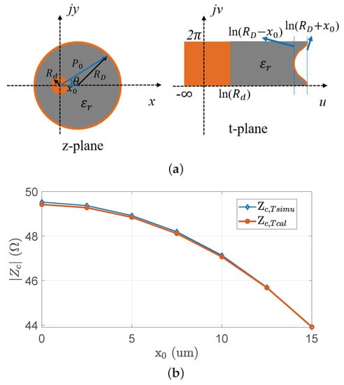 In a practical fabrication process, there is micromachining tolerance, which might result in a central deviation of the central signal conductor. As presented in the plane in Figure 4a, the center of the signal conductor has been offset by along the X axis. is the angle between and the X axis, and is the actual distance between the center of the signal conductor and the inner surface of the outside conductor. Based on the transformation equation , the structure in the plane is transformed to a new geometry in the plane, as seen in Figure 4a. It is seen that the inside surface of the outer conductor is no longer a straight line that is in parallel with . In this case, an effective is needed to replace the position of , so that the impedance can still be calculated with (7). By using the image method for the cross-section of the coaxial-like TSV in the plane, the effective is obtained as follows