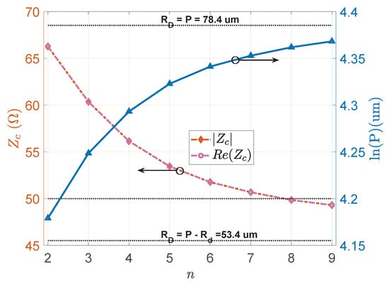 In the other simulation group, the cylindrical Cu TSVs still have a radius of = 25 m. While, aiming at maintaining being always at 50 , the TSV center distance P and the ground-TSV number n are adjusted simultaneously. When the number of ground TSVs increase from 2 to 9, the obtained TSV center distance P are m, 70 m, m, m, m, m, m, and m, respectively. The TSV center distance in the natural logarithm form at different ground-TSV numbers are presented in Figure 6. It can be noticed that there is a nonlinear relationship between and n. Generally, for constant , larger is required when there are more ground TSVs. By comparing the results of the two analytical groups, it can be concluded that when the ground TSV number is determined, the larger TSV center distance P is related to a smaller characteristic impedance , which is similar to the trend shown in (7).