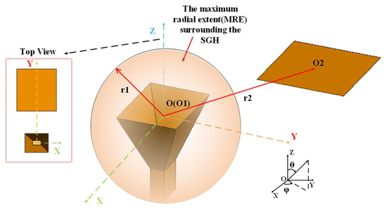 The schematic diagram of the simulation model is shown in Figure 1 below, using Cartesian coordinates. The phase center(O1) of the standard gain horn is located at the origin(O) of the coordinate system of the measurement system. The XOY plane of the coordinate axis is parallel to the antenna aperture plane and the maximum radiation direction is along the Z axis. The metal plate has a size of 200 mm × 200 mm; its four sides are parallel to the coordinate axis; the surface is parallel to the antenna aperture surface; and its center (O2) is located at (0, 625 mm, 625 mm), which simulates the interference objects that cause multi-path effects in the measurement field.