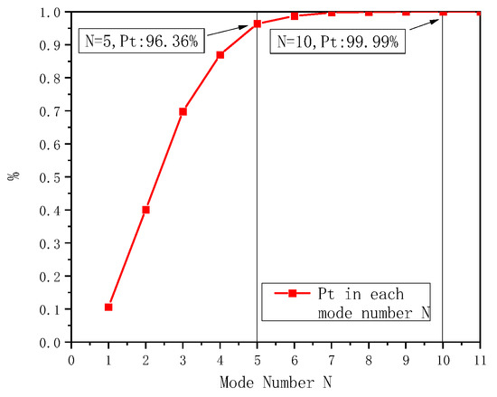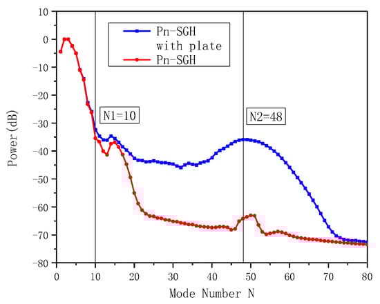 The power spectrum distribution curve of the single horn antenna model in Figure 2 shows that the radiated power of SGH is mainly distributed on the low-order mode terms, and the radiated power decreases rapidly with the increase in the number of mode terms until it can be ignored. Figure 3 shows that only the first 10 terms are required to include 99.99% of the SGH radiated power. This is consistent with the selection of the first N1 = [k × r1] = 10 terms in the spherical wave mode term number truncation principle. For the SGH with the same operating frequency (2.4 GHz) and the same size, only the first 10 items of its radiation field SMCs are needed to fully express its radiation characteristics. For the power spectrum distribution of the horn antenna in the presence of the metal plate in Figure 2, the power distribution also appears in several items near the 48th item of the spherical wave mode item, and the maximum power distribution item N2 = 48 is consistent with the position of the metal plate N2 = [k × r2] = 48, where the power represents the interference of the metal plate as an interference source to the radiation field of the horn antenna. The modal filtering technology determines the number of corresponding mode items according to the spatial distribution of different field sources, and extracts the mode items corresponding to the AUT to filter out the mode items corresponding to the interference sources. That is, the influence of the interference source is filtered out from the radiation field of the AUT containing external interference, and the radiation characteristics of the AUT in which the external interference source is suppressed are obtained. The interference from the environment is effectively reduced and accurate measurement of the AUT is realized.
