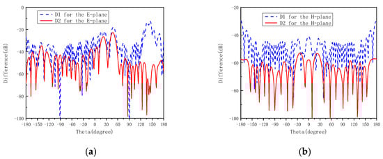 In Figure 5, the blue dotted curve D1 for the E-plane represents the difference value D1 in the measured AUT radiation field with and without the metal plate. The red solid curve shows the difference value D2 between the field after modal filtering the field in the presence of a metal plate interferer and the radiated field from the AUT alone. At all angles, the modal filtering technology reduces the influence of the interference source on the AUT. On the E-plane of the SGH, the maximum 15 dB interference is filtered out at the −25 dB level, so that the difference between the two curves is reduced from the maximum −17 dB to −50 dB. On the H-plane of the SGH, the maximum 5 dB interference is filtered out at the −35 dB level, so that the difference between the two curves is reduced from the maximum −30 dB to −58 dB.