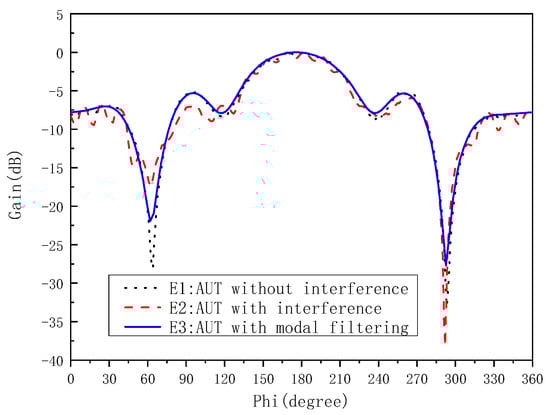 From the two different test environments of Figure 6 and Figure 8, the pattern E1 of the AUT without interference and the pattern E2 of the metal plate interference are obtained. For the electric field E2 with a multi-path effect, the modal filtering technology is applied to suppress the influence of the metal plate on the AUT test results. If the antenna size and operating frequency are known, the corresponding number of mode items is N1 = [k1 × r0] = 5, k1 = 2π/λ1. Taking the first five items of the spherical wave expansion mode items of the electric field E2, the influence of the metal plate can be suppressed and the accurate antenna measurement pattern E3 after filtering can be obtained. The measurement results are shown in Figure 9 below.