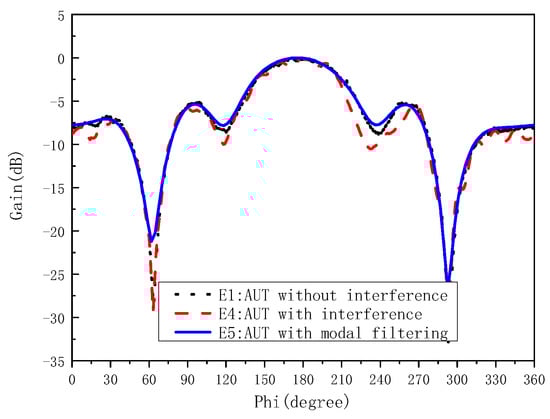 The processing steps of modal filtering are the same as those of experiment I. In this experiment, the wideband antenna to be tested is at a different operating frequency of 6 GHz, so the number of mode terms corresponding to the smallest spherical wave surrounding the antenna has changed compared with before, N2 = [k2 × r0] = 7, k2 = 2π/λ2. Taking the first seven items in the spherical wave expansion mode items of the interference electric field E4 with the presence of metal balls, the interference can be suppressed and the filtered antenna pattern E5 can be obtained. The analysis and comparison of the antenna pattern E1 without interference, the antenna pattern E4 with metal balls, and the field E5 after modal filtering of the electric field E4 are shown in Figure 11 below.
