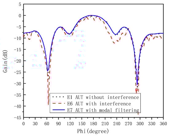 The processing procedure of modal filtering is the same as in experiment I. In order to verify the broadband characteristics of the method, the operating frequency of the antenna under test is set as 7.5 GHz and the wavelength is λ3 = 40 mm in this experiment. At this time, the radius of the minimum sphere surrounding the antenna remains the same, r0 = 52.2 mm. Owing to the change in the working frequency, the corresponding number of mode terms has changed, N3 = [k3 × r0] = 8, k3 = 2π/λ3. Taking the first eight items in the spherical wave expansion mode items of the interference electric field E6 with the presence of the metal dihedral angle structure, the interference can be suppressed and the filtered antenna pattern E7 can be obtained. The analysis and comparison of the antenna pattern E1 without interference, the antenna pattern E6 with the metal dihedral angle structure, and the field E7 after modal filtering of the electric field E6 are shown in Figure 13 below.
