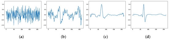 The ECG signals generated by the model at different stages are plotted as pictures, as shown in Figure 2. Figure 2a shows the high-dimensional random noise input at the beginning of training, and the output is also completely noisy at this time; Figure 2b shows the output at 100 rounds of training, where the output can be seen to have some of the morphological features of ECG, but the generated samples are still more noise biased; Figure 2c shows the output at 300 rounds of training, where the generated has the morphology of ECG, but it is not smooth enough; Figure 2d shows the output at 800 rounds of training when the generated ECG can successfully fool the discriminator and make it lose its judgment, and the adversarial training enters the Nash equilibrium state and the network converges.