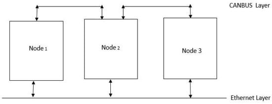 There is a limited amount of research on the usage of the Ethernet in conjunction with the CANBUS. W. Chen et al. discussed how to extend the local area network (LAN) over the CANBUS using wired devices to extend the connectivity of the inputs to the network [20]. The low setup cost of the CANBUS has led to the convenience of its quick diagnostics and popular usage for real-time analysis for diverse simulations [21]. A combination of the Ethernet and CANBUS was used to create a control system based on data exchange to measure the large amount of real-time information between mounted devices and different control nodes in autonomous underwater vehicles [22]. Siddiqui proposed a secure means of communication over the CANBUS [23].