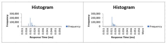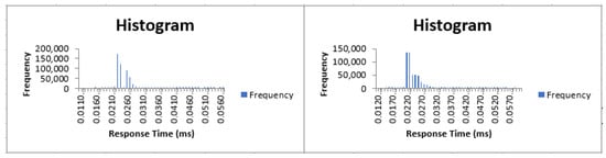 Figure 7 shows that the traffic response time changed again when a high traffic load was sent over the CANBUS data path. This test showed that, when the maximum allowable traffic data load was sent over the CANBUS data path, the response time increased to 0.023 ms, and it jumped to 0.03 ms when the number of times that it was sent was doubled as observed in the histogram. This shows the limitation in the capacity of the CANBUS and opened the door for the inclusion of a faster data communication path that can handle a higher amount of traffic load to minimize the bottleneck.