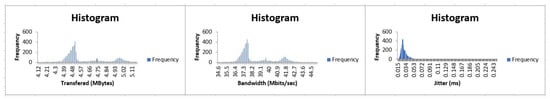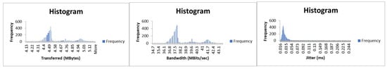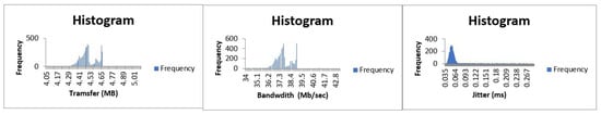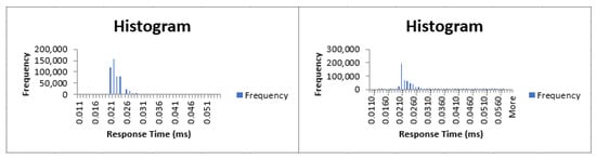 From the histogram results shown in Figure 5, we observed that all of the packets were able to make it through to the destination with good response times from both sources when low data loads were sent repeatedly, with approximately 50% showing a response time of 0.021 ms and 0.022 ms. This shows that, when data loads are low, we are able to pass these low data loads through the CANBUS data paths to the destination with a good performance.
