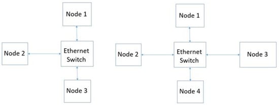 The second phase of the experimental test is the Ethernet portion of the lab experiment. The same number of nodes was used to represent sensors sending data to node 2. The nodes were all connected to an eight-port 100 Mb/s Ethernet switch. The available bandwidth or data rate can be increased with the usage of higher-speed switches.