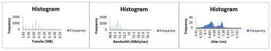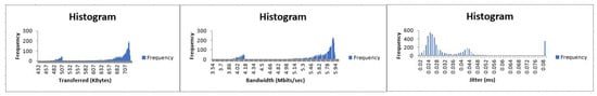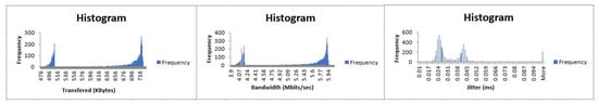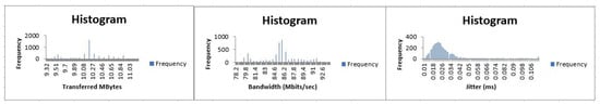 The virtualized setup in the lab was deployed for the purpose of running different tests through different data pathways while monitoring the impacts on the bandwidths in each data path. The data packets sent were monitored to evaluate the impacts as the packet sizes were increased and data were transmitted. When different levels of traffic and congestion were created on both data paths, the data packets were monitored. This information helped the smart nodes and the traffic analyzers to have sufficient information to decide how to route different data messages in the prototype. The increase in the number of times that data were sent repeatedly helped to study the CPU power that may be required by the smart nodes and traffic analyzers. We also took advantage of the Iperf tool to extract the jitter behavior from the major parameters that were common to both data paths.