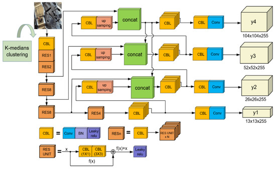 Additionally, by connecting the 8× downsampling fusion feature map with the 4× downsampling feature map, this approach increases the number of prediction layers from three to four. The 4× downsampling fusion feature map was employed to find smaller target studs. Figure 2 depicts the altered YOLOv3 structure used in this study.