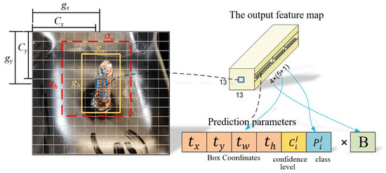 For example, the grid prediction feature map size is 13 × 13, the values of , . are 6, 5, respectively; the value of is 1; the value of is 0; the values of and are all 1; the width of the feature map is 13 and the height of the feature map is 13, as shown in Figure 3. To overcome the imbalance between positive and negative samples, the hyperparameters , , , and are set to values from previous work [17,18,19,31,32], which are 0.95, 8, 5, and 0.5, respectively, applicable to the stud image dataset used in this paper. The set of parameters can be solved from the predicted parameters of the output feature map and the following equations: