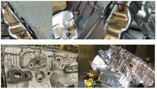 In this evaluation, 4000 stud images were collected from the site of an automotive production line. The images contain different types of stud targets in near and far views, and some data samples are shown in Figure 4. As shown in Figure 4, there is significant background noise interference when automotive workpieces are inspected on the production line, such as jigs, protective fences, and other auxiliary equipment in the work section. In addition, in some views, stud targets are difficult to identify because they occupy a small area in the field of view. Real-time detection of stud targets on a production line is hence challenging.