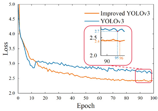 Loss values of YOLOv3 and the improved YOLOv3.