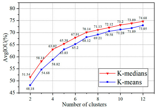 The AvgIOU values were compared for the proposed clustering approach with those of the K-means method using the automotive workpiece stud image dataset. The results are presented in Table 3. As the number of cluster centers increases, the two algorithms’ AvgIOU values increase, with the critical point being when the cluster centers are equal to seven. When K is less than seven, the slope of the AvgIOU curve is more significant, and when K more than seven, the curve gradually flattens out, as shown in Figure 6. This is because, as the number of clustering centers increases, there is a better fit between the a priori anchor box generated by the model and the ground truth box. However, it is essential to note that too many clustering centers increase the computational complexity of the algorithm during forward propagation and backpropagation. In practice, when the output layer of the network structure model consists of four nodes, 12 clustering centers are required to meet the detection requirements. When the number of clustering centers is 12, the AvgIOU values of the proposed algorithm and the YOLOv3 algorithm are 74.68% and 73.05%, respectively. The new clustering method applied in the proposed algorithm improves the results of the YOLOv3 algorithm by 1.63%. Therefore, the proposed clustering method is effective.
