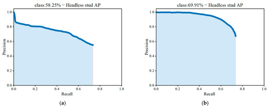 Average precision (AP) and mean average precision (mAP) are the integral of the accuracy recall curve and average accuracy of all types of studs on the workpiece, respectively [41]. These indicators are expressed as follows.