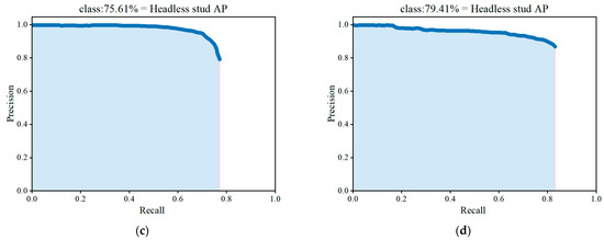 P-R curves of four methods on the studs dataset. (a) SSD; (b) Faster R-CNN; (c) YOLOv3; (d) Improved YOLOv3.