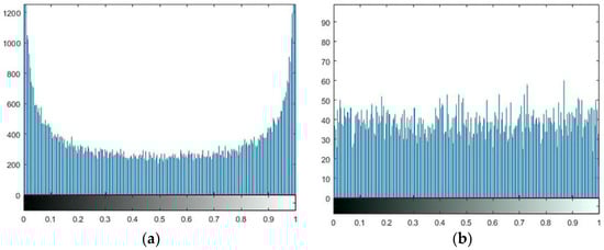 when , represents the size of the lattice. In this paper, when the CML system is used at the pixel level, it is set to 10; represents the evolution time, is the coupling coefficient, and the edge conditions are satisfied. and and are used as keys. When is a chaotic map, the dynamical characteristics of the system are also chaotic. In the course of the study, and , and 10 grids were selected and iterated 10,000 times. There was a phenomenon of two-level differentiation. When different coefficients were selected, the histogram data showed different degrees of two-level differentiation. As shown in Figure 1.
