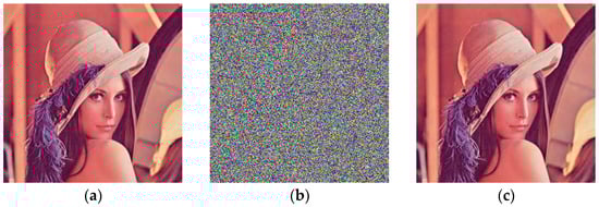 Lena encryption process. (a) Original image Lena; (b) encrypted image Lena; (c) decrypted image Lena.
