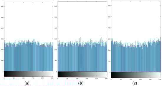 RGB histogram of Lena after encryption. (a) encrypted, Lena’s R-channel pixel histogram; (b) encrypted, G-channel pixel histogram; (c) encrypted, B-channel pixel histogram.