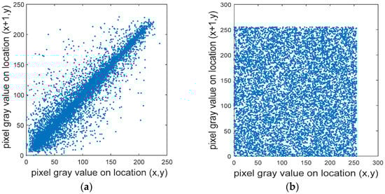 To resist statistical attacks, the correlation between adjacent pixels must be effectively reduced [31,32,44]. Using Equation (10) to calculate the correlation between the adjacent pixels of the plaintext and the ciphertext images, we randomly select 10,000 pairs of pixels in the plaintext and the ciphertext images of the “Lena” R channel, as shown in Figure 10. The correlations between the adjacent pixels of the horizontal, vertical, and diagonal lines of these pixels are also tested, as shown in Table 2.