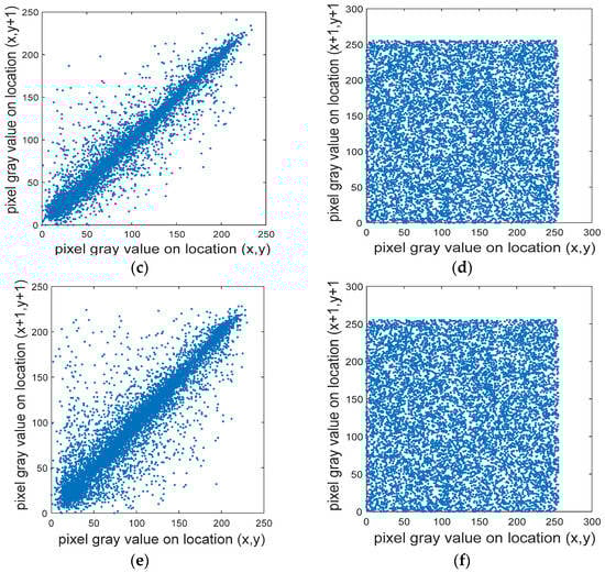 The level of adjacent-pixel correlation. (a) Lena plaintext; (b) Lena ciphertext horizontal correlation; (c) Lena plaintext vertical correlation; (d) Lena clear text vertical correlation; (e) Lena plaintext diagonal correlation; (f) Lena plaintext diagonal correlation.