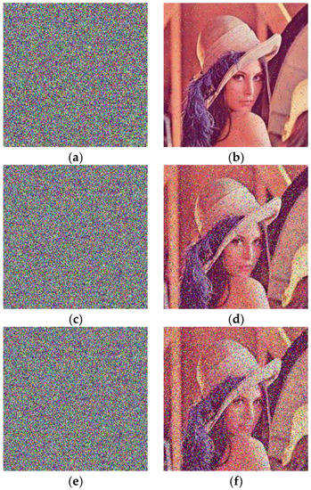 We use a noise attack and block attack to test the robustness of the algorithm [32,44]. Compared with other common noise types, salt-and-pepper noise has a greater direct impact on the ciphertext image. Therefore, this experiment considers the effect on the plaintext image after adding salt-and-pepper noise to the algorithm. We add different strengths of salt-and-pepper noise to the plaintext and use the same key for encryption and decryption. Figure 11 shows the encrypted image with three noise values of 0.02, 0.12, and 0.2, respectively.