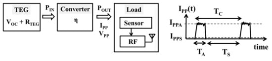 A thermoelectric generator (TEG) is a device generating electric power based on temperature differences, which is known as the Seebeck effect [1,2,3]. A TEG is a key device for energy harvesting among many alternatives such as photovoltaic generators and electrostatic, electromagnetic, magnetostrictive or piezoelectric vibration devices [4]. Given that a nominal TEG can only generate an output voltage on an order of 10–100 mV with a few K temperature difference, a power converter is needed to operate integrated circuits (ICs) including sensor and RF at a higher voltages such as 3 V in autonomous sensor modules [5,6,7,8,9], as shown in Figure 1, where VOC (RTEG) is the open circuit voltage (output resistance) of TEG, η is the power conversion efficiency of the converter, and VPP (IPP, POUT) is the output voltage (average output current, average output power) of the converter to drive sensor and RF blocks.