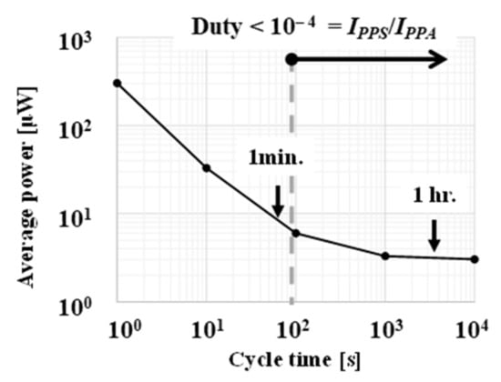 where IPPA, TA, IPPS, TS, and TC are an average current in operation, an operation period per sense and data transmission, an average stand-by current, a stand-by period, and a cycle time per operation, respectively, as shown in Figure 1. Note that a rechargeable battery or a large capacitor is usually connected at the input terminal of the loading device to stabilize the input voltage of the sensor/RF IC against large IPPA. Figure 3 shows the average power as a function of TC in case of VPP of 3 V, IPPS of 1 μA, IPPA of 10 mA, a bit rate of 1 Mbps, and 1 k-bytes/packet with Bluetooth low energy [13]. At a duty of 10−4 or lower, IPP can be as low as 10 μW. Thus, the requirement for the output power of the converter is determined. From a system viewpoint, one may want to design a TEG structure in such a way that the output power of the converter is maximized under a given load condition.