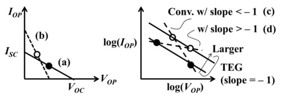 Finally, TEG with minimum area and the maximum operating point are determined by the filled circle rather than the blank one on the curve (c) or (d) in Figure 4, depending on the converter characteristic with a slope of <−1 or >−1. A trajectory of the maximum power point of TEG with a given area on log(IOP) − log(VOP) plane has a slope of −1. The trajectory of smaller TEG becomes closer to the origin. When the converter has a slope of <−1 as described by the curve (c) in Figure 4, the maximum power point is located at a relatively higher VOP and a relatively lower IOP than the case of using a converter whose slope is greater than −1.