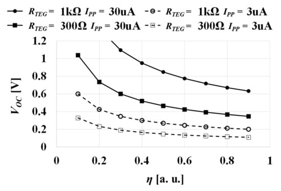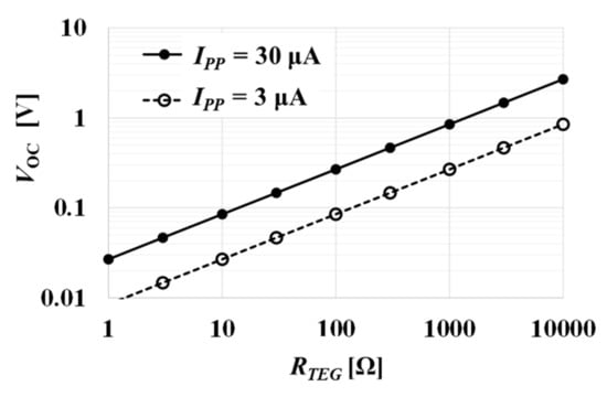 Several conditions for TEG design are studied as follows. When the TEG area and structure are given, VOC can be varied only by increasing ΔT. The minimum ΔT is determined by (4). VOC depends on the square root of VPP, IPP, RTEG, and η. Among them, VPP and η are expected to not change significantly, at least in a short term. Figure 5 shows VOC vs. η with IPP = 30 μA or 3 μA and RTEG = 300 Ω or 1 kΩ at VPP = 3 V based on (4). When η is nominally 50%, an improvement in η by 10% only gives 10% reduction in VOC. Similar goes to VPP. As a result, it is considered that VPP and η are not effective design parameters to mitigate the requirement for reducing VOC.