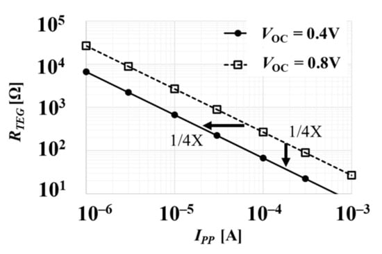 Figure 8 shows a relationship between (4) and (7). The cross points of them express the values of RTEG and VOC for a given condition of VTC/RTC = 0.45 mA, IPP =30 μA, η = 0.5, VPP = 3 V. Given that η is assumed to be constant over VOP for simplicity in this section, one cannot determine NS and NP to minimize TEG area. Therefore, in order to design TEG with minimum cost, a converter needs to be optimally designed by VOP precisely.