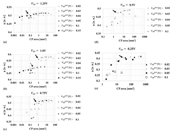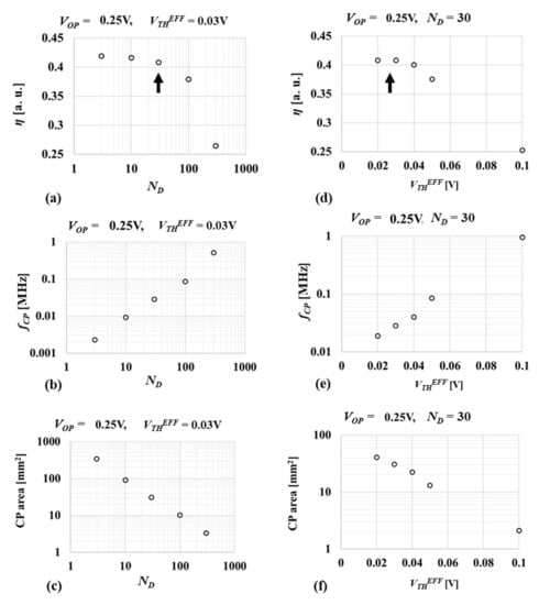 Figure 10a–e show η vs. CP area when VTHEFF is varied between 0.02 V and 0.15 V and ND is varied among 10, 30, 100, 300, 1000 at VOP of 1.25 V in (a) through 0.25 V in (e), respectively. In this work, η is the highest priority, but a very strict constraint could need too large a CP area. Considering a trade-off between η and CP area, the best combination of the CP design parameters is determined, in order to have 2% lower η than its peak value, which is shown by an arrow in each figure. There were two groups in Figure 10b. One has η > 0.55 and the other has η < 0.5. The former has NCP of three whereas the latter has NCP of four. As VOP decreases, the number of groups with different numbers of NCP increases. Smooth variations on η—CP area curves come from variations in VTHEFF or ND while NCP is unchanged.