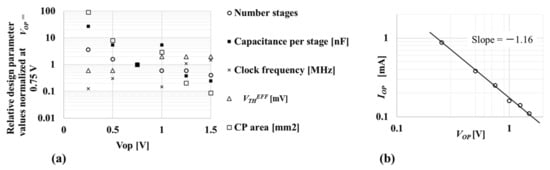 Figure 12a shows the relative design parameter values normalized by the values at Vop = 0.75 V, which are ND = 300, NCP = 5, CCP = 1.1 nF, fCP = 113 kHz, αT = 2.9 %, VTHEFF = 40 mV, ACP = 0.62 mm2, IOP = 240 μA, η = 0.50. Capacitance per stage and CP area have strong Vop dependence except for the glitches at Vop = 1.0 V, as explained above on Figure 10b. Higher Vop is generally required to have small CP for cost reduction. Figure 12b shows the input current of CP, IOP, when the CP is designed to run at the input voltage of VOP to output IPP at VPP with the high η. The slope was about −1.16 like the curve (c) of Figure 4, which indicates that a higher VOP basically allows a smaller TEG.
