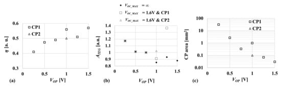 Figure 13a shows η of CP vs. VOP. CP1′s were the optimized designs as shown by the bold arrows in Figure 10a–e. CP2 indicates another design with 6% lower η and 90% smaller area at VOP = 1 V shown by the broken arrow in Figure 10b. η tends to increase as VOP. Figure 13b shows TEG area as a function of VOP by using (9) or (11) for the CPs depending on whether a variable VOC range is unlimited or limited. Equation (9) is valid across the entire VOP range in case of VOC_MAX ≥ 3 V whereas (11) is used when VOP ≥ 0.8 V in case of VOC_MAX = 1.6 V. TEG can be minimized at a higher VOP when VOC_MAX ≥ 3 V because CP nominally has a higher η at a higher VOP. On the other hand, when VOC_MAX is limited, VOP around VOC_MAX/2 provides the minimum area for TEG. In this demonstration, VOP to have TEG area as small as minimum is 1.0 V with CP1 or between 0.5 V and 0.75 V with CP1 or 1.0 V with CP2. Figure 13c shows CP area as a function of VOP. Basically, CP area exponentially increases as VOP decreases. When VOC_MAX is limited at 1.6 V, the minimum TEG cost is realized with CP1 operated at 1.0 V. CP1 area is about 1.0 mm2. If 10% larger TEG cost is acceptable, CP2 with 0.1 mm2 would be another option. Thus, once the actual operating point VOP and IOP are determined based on such graphs as Figure 13b,c, one can design TEG based on (22) or (26) under the condition that RTC and the minimum VTC of a unit TEG are given, depending on the VOC_MAX condition as discussed above.