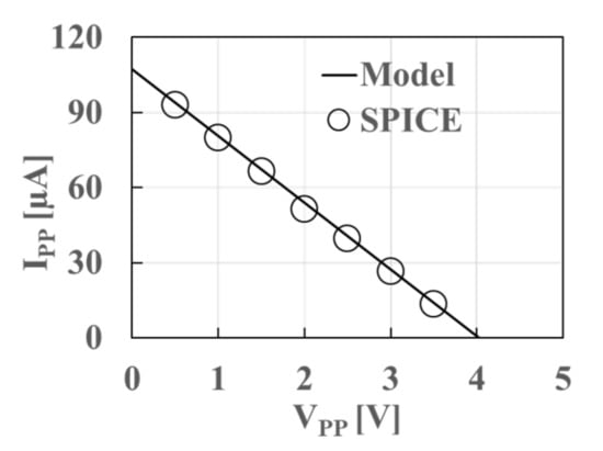 To see if the CP design flow using Table I is sufficiently valid, the gate-level CP2 circuit to operate at VOP of 1.0 V was designed in 65 nm CMOS. Ultra-low-power diodes [20] were used for switching diodes. The CP was simulated together with TEG whose VOC and RTEG were 1.6 V and 2.5 kΩ, respectively. The VPP–IPP curve of the model was in good agreement with SPICE simulation as shown in Figure 14.
