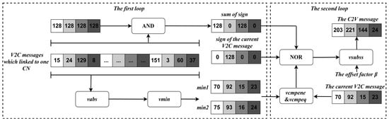 Each thread in the check node update kernel corresponds to one CN, and the C2V messages of the relevant check node in the Tanner graph are computed in this kernel. Since the CN computation of MSA can be reduced to multiplication and addition, searching for the minimum and sign computations are performed separately. Two loops in this kernel each perform one of these computations, respectively. In the first loop, the minimum value and subminimum value in all absolute values of the messages are found using the vmin and vabs instructions to scan all VNs linked to the corresponding CN, and the total product of the sign values is also computed. In the second loop, the absolute values of the current message are selected from and by the vcmpene and vcmpeq instructions, and the sign bit is obtained by multiplying the sign value of the current V2C message and the total product of the sign values obtained from the first loop. The implementation of the check node update process in this kernel is shown in Figure 4.