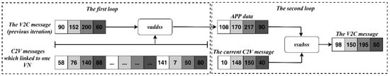 The implementation of this kernel follows the updated principle of one thread for one VN. This kernel includes two loops. By calculating the sum of the message and message of the connected edge, the first loop updates the APP data (the vaddss instruction is used). Utilizing the APP data to subtract the C2V message of the linked one (the vsubss instruction is used), the second loop can yield the message of each VN. The implementation of the variable node update process in this kernel is shown in Figure 5.